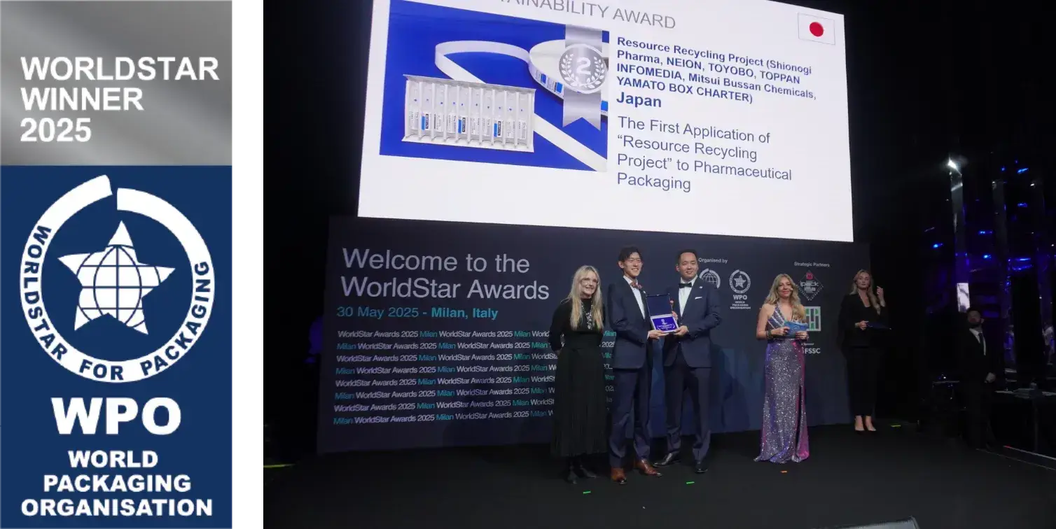 Le 30 mai 2025, lors de la cérémonie de remise du prix « WorldStar 2025 Sustainability Special Award » organisée à Milan, en Italie, par l’Organisation mondiale de l’emballage (WPO ; World Packaging Organisation), notre « première application du projet japonais Resource Recycling Project à l’emballage de produits pharmaceutiques » a été récompensé récompensée d’un prix d’argent dans la catégorie « Prix spécial – Durabilité ».