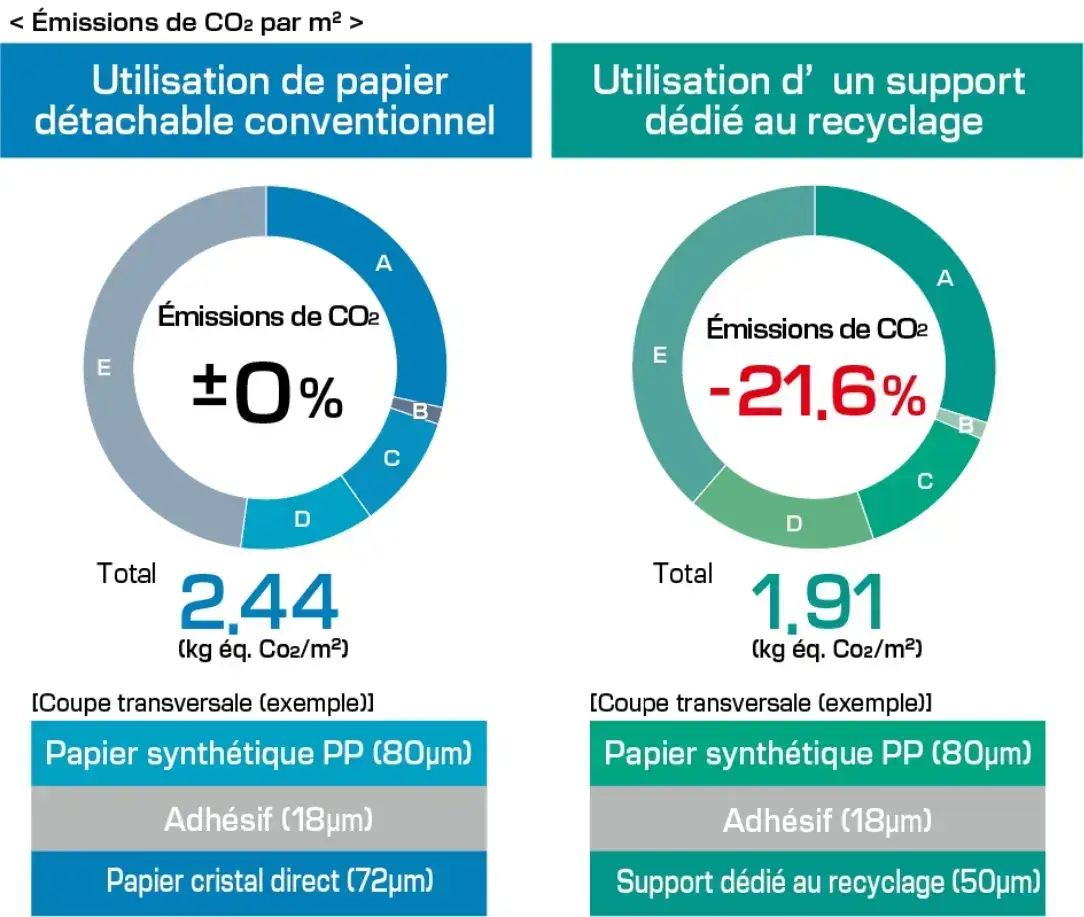 Les résultats ci-contre sont une comparaison des émissions de CO2 provenant de l’ACV (analyse du cycle de vie) d’étiquettes utilisant un support conventionnel et de celle d’étiquettes utilisant un support dédié au recyclage, et n’ont pas vocation à déterminer la supériorité ou l’infériorité de l’un des produits.Par ailleurs, l’ACV des produits est calculée sur la base de nos propres prérequis qui sont les suivants :