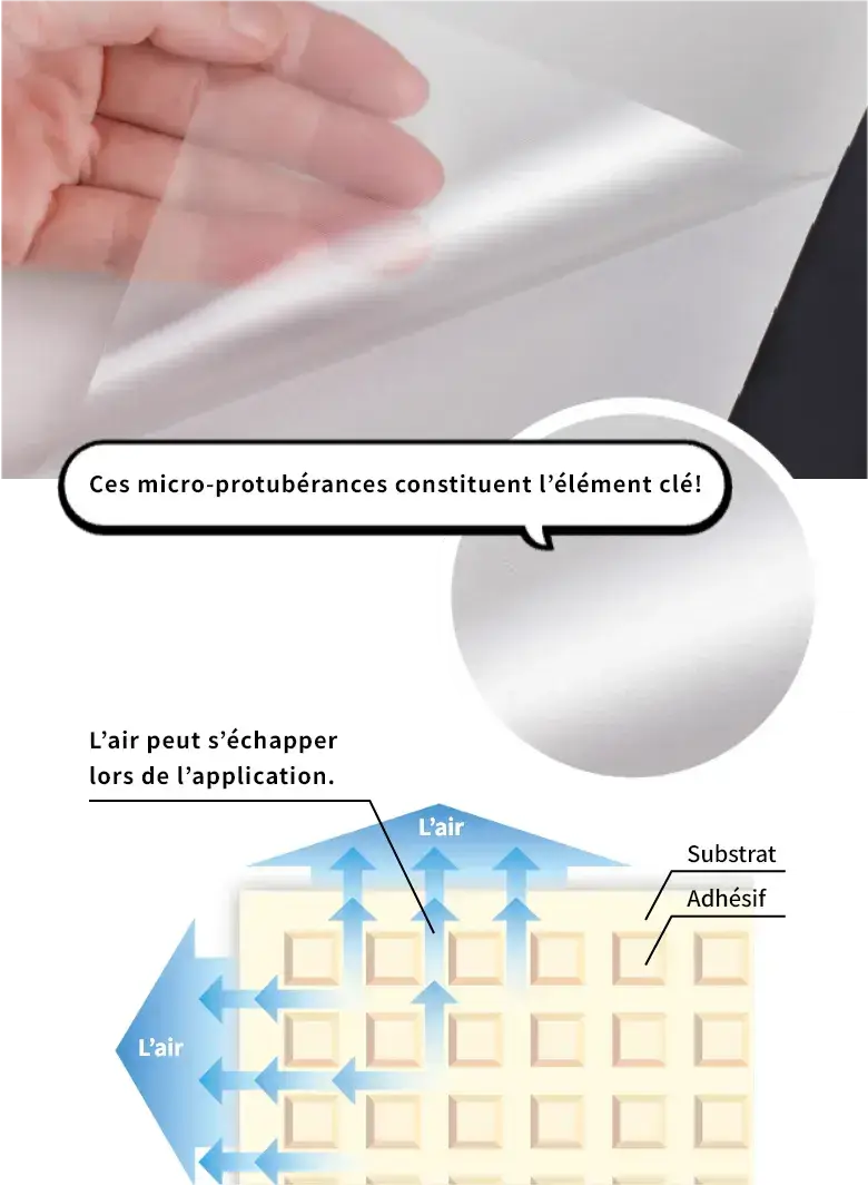 « MATRIX » est un traitement adhésif spécifique grâce auquel des micro-protubérances sont formées sur la surface adhésive, créant ainsi des rainures horizontales et verticales ultrafines par lesquelles l’air et le gaz peuvent s’échapper. La technologie utilise un adhésif doté d’excellentes propriétés adhésives permettant de s’adapter à différents types de substrats, tout en conservant une force adhésive équivalente ou supérieure à celle des produits conventionnels.
